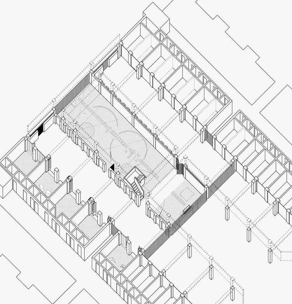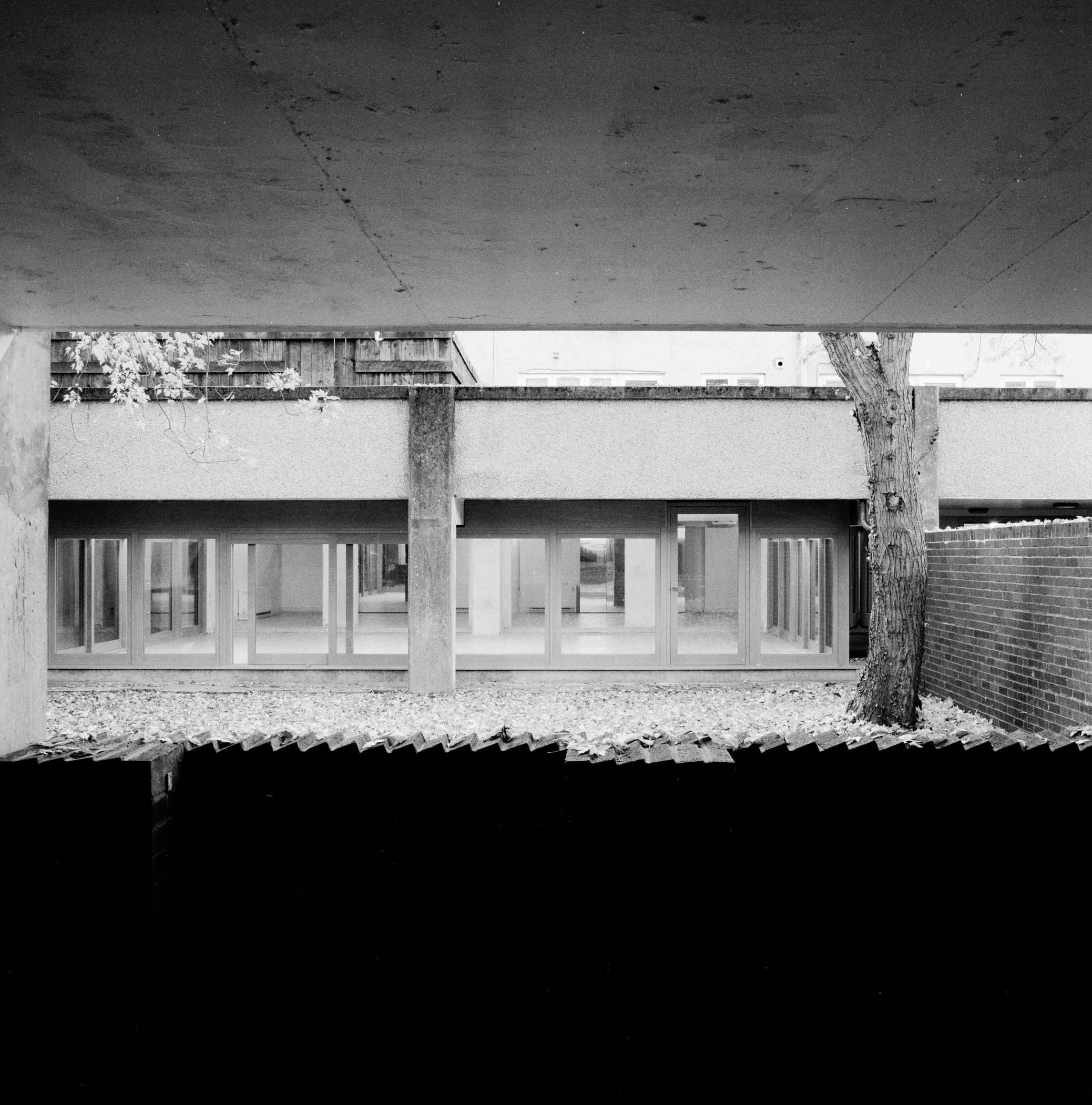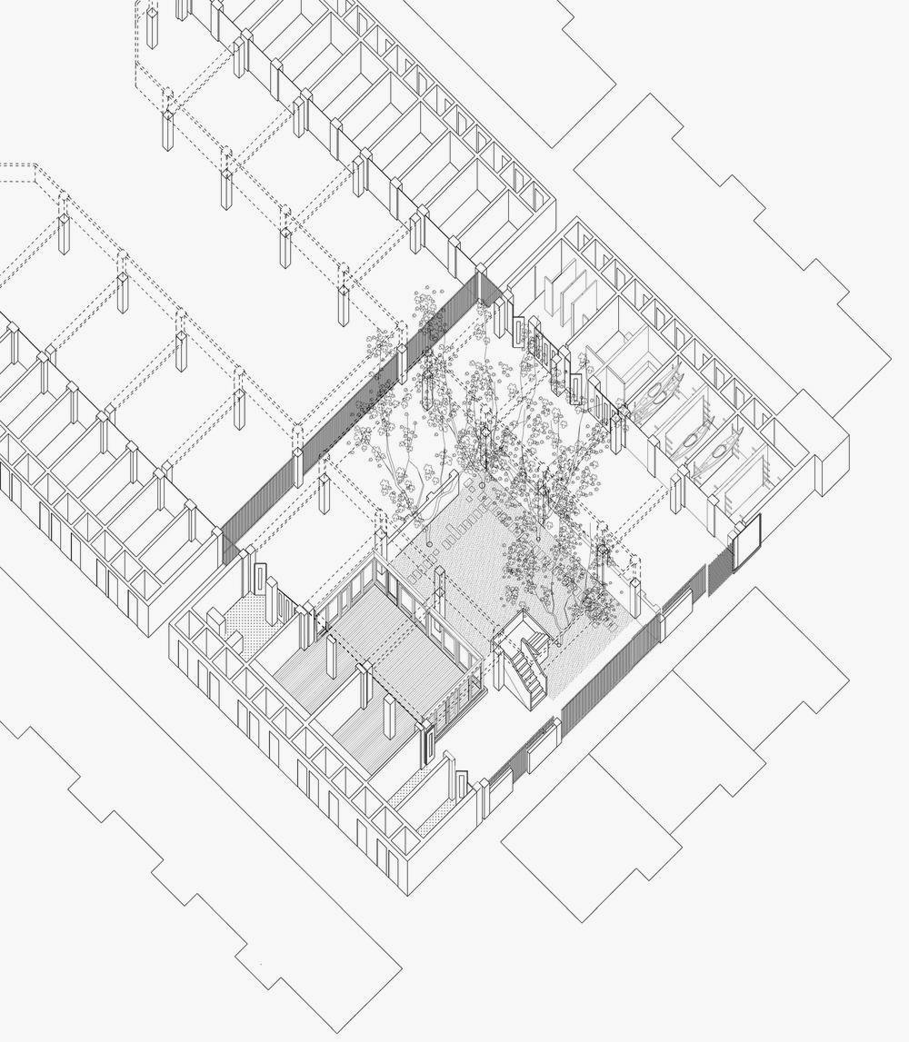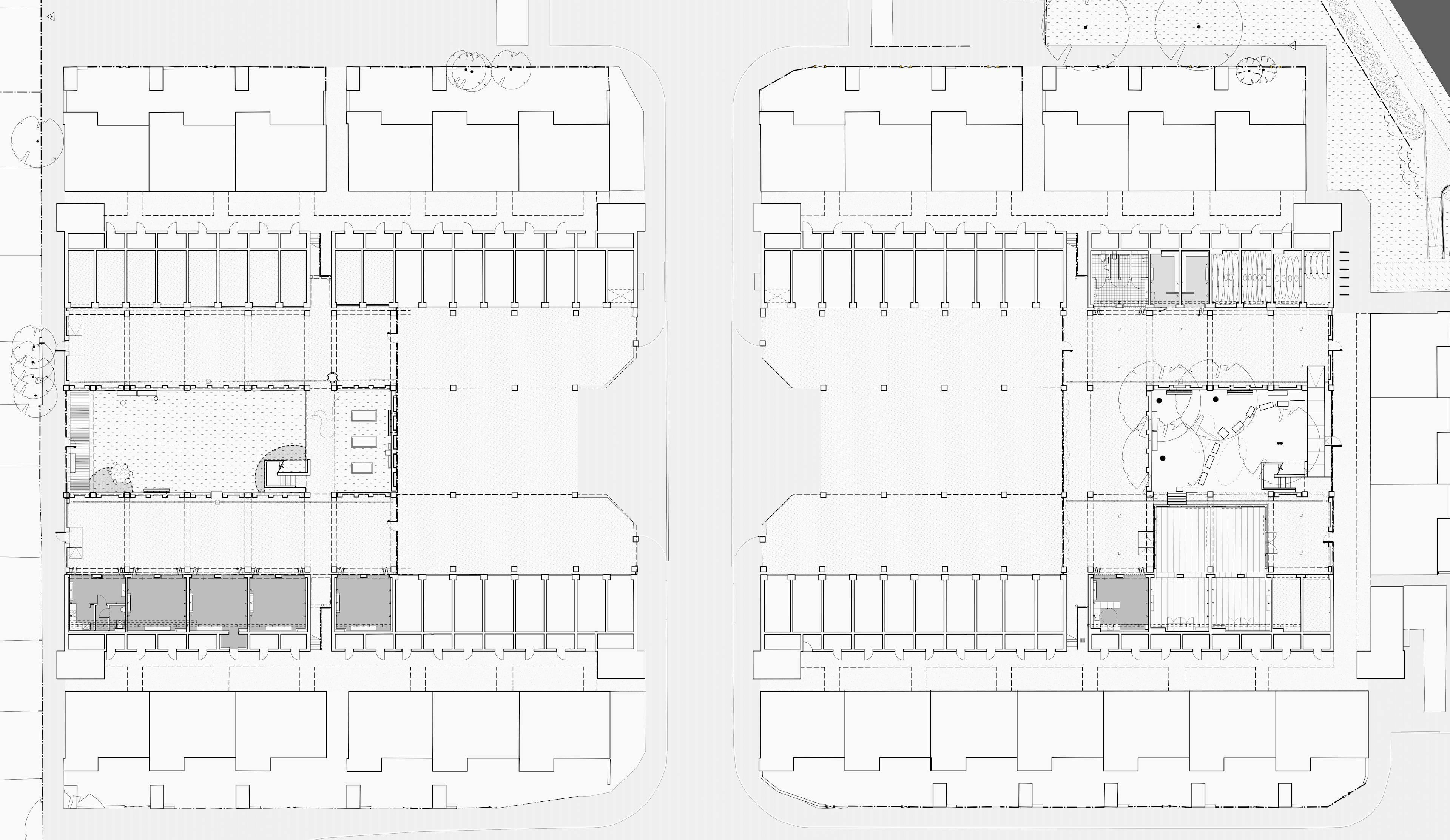 The project brings together landscape and architecture. The plan of the site is two enclosed gardens, lined with deep cloister like undercrofts and a series of former garages. Each interior opens directly into a shared exterior space.