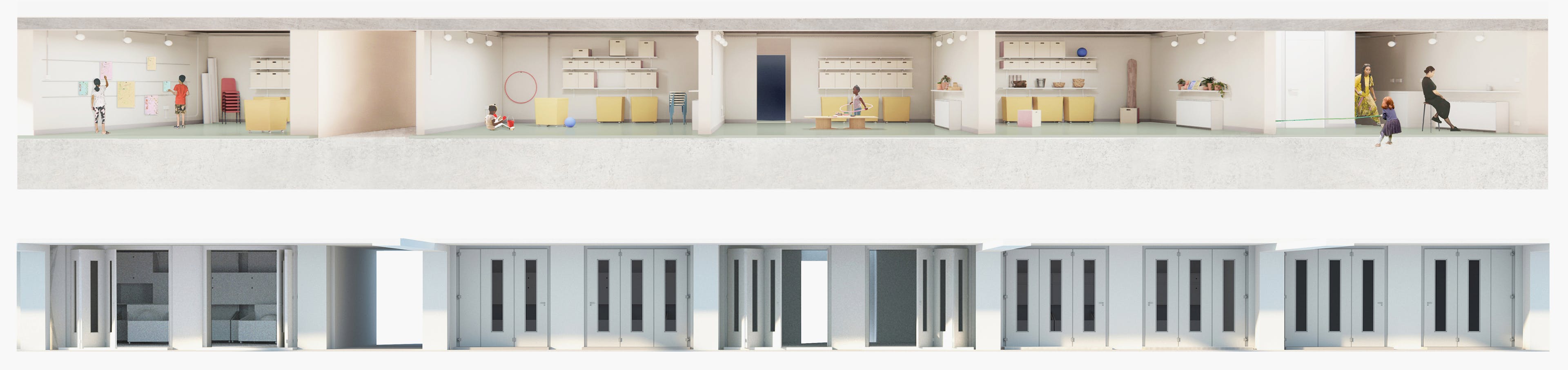 Design proposals focus on the Willowbrook block within the wider estate. At the southern end of the block, the garages and undercrofts have been remodelled to hold a community gym/ multipurpose room, storage, changing facilities and a kitchenette that open on to a garden courtyard. Whilst at the northern end of Willowbrook, they are converted into a series of playrooms with toy library storage, that open onto a garden designed for nature led, loose parts play.