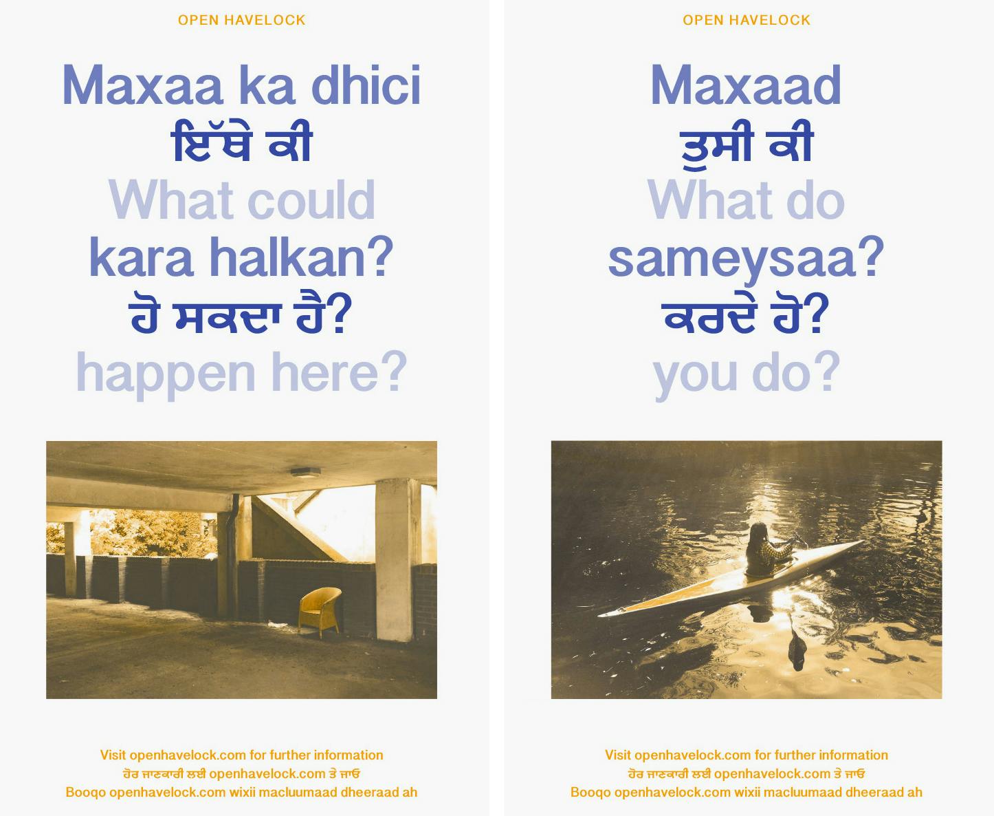 The majority of people living in Havelock were born outside the UK and 37% of households have no household members who have English as a main language. The project began with an identity, under the name Open Havelock. A series of screen printed posters and flyers were distributed across the estate asking two questions in three languages (Somali, Punjabi and English) and a website, openhavelock.com, was set up to capture informal activity in an online map. Transcribed long form interviews by the Decorators form a rich portrait of perceptions of the estate and its everyday use. Listen to them here soundcloud.com/user-445787173/havelock-conversations.
